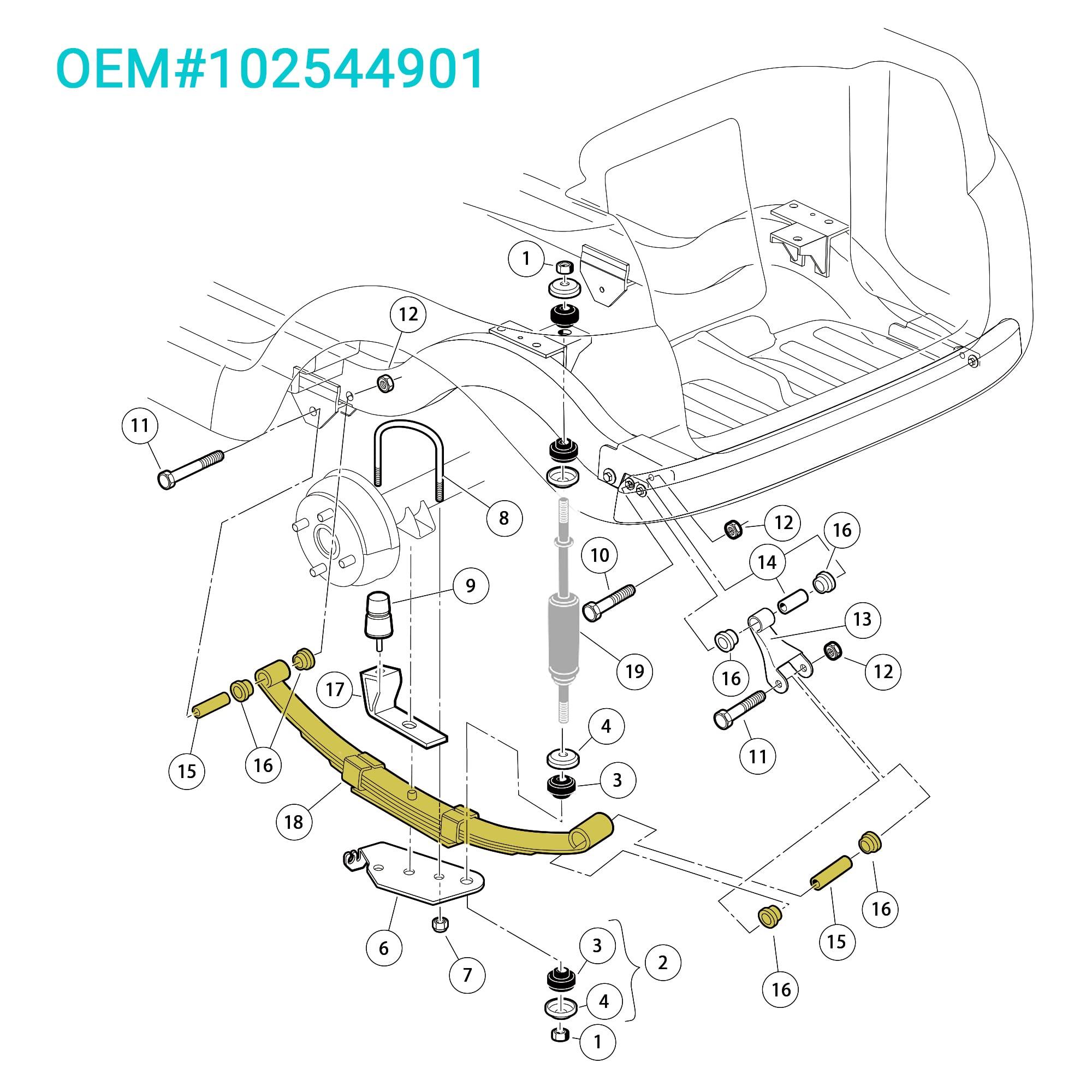 - IncludedClub car precedent heavy-duty rear leaf spring kit includes:2*heavy duty leaf springs(replace OEM 102509301, 102513001), 8*urethane bushings(OEM 102506601), 4*metal sleeve spacers(OEM 102506401), 2*U-Bolt(OEM 1012180)