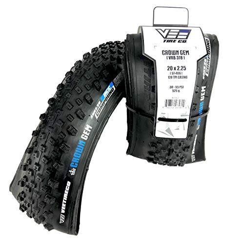 This is a pair of 20x2.25 Crown Gem Bicycle Tires with Dual Control Compound. The Crown Gem is ideal for all mountain and endurance riding because of the knob spacing and height. It has taller side knobs for better cornering control and an aggressive yet fast center knob pattern for undeniable traction. Even the width of the tire contributes to its consistent ride. Vee Tire has been a leading manufacturer of high quality bicycle tires and tubes since 1977. Produced in Thailand, each of their products are carefully crafted with select raw materials using state of the art modern technologies giving Vee Tire a leading edge over the cheaper low cost products on the market. Ride with confidence and Ride Safe with Vee Tire!