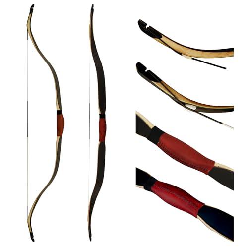 - [Design and Materials] Made of fiberglass and bamboo laminated. The handle and two bow tips of the bow are made of ash wood. The bow handle is convex outward and straight on the inside and adopt wrap the handle with cowhide, Ergonomic, which can give the user a comfortable feeling. German lamination technology to make its performance more superior.