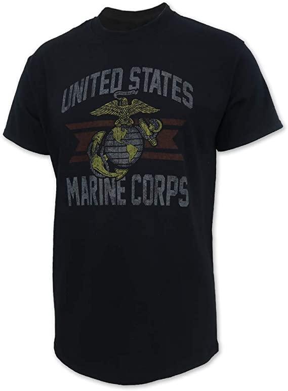 - Vintage faded screen print tee with the USMC logo in red, white, and flat golden yellow on a graphite gray field. Part of our line of matching distressed apparel for the Army, Navy, Marines, Coast Guard, and Air Force. Imported garment designed and printed in the USA.