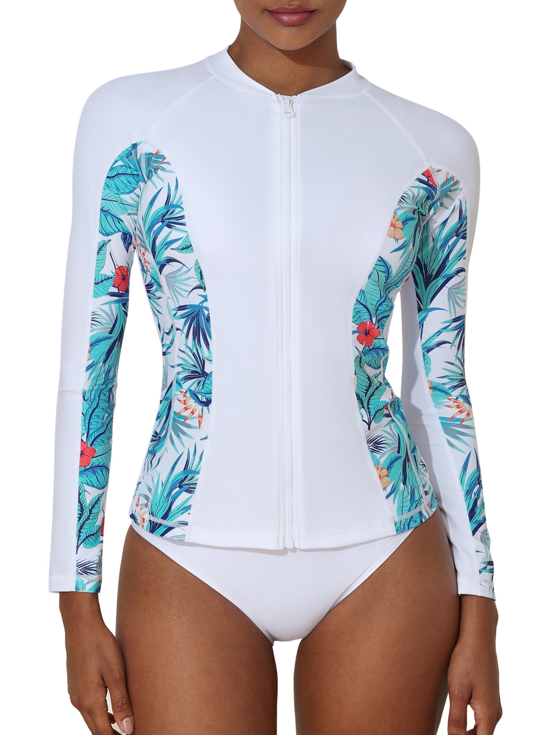 - FRONT ZIPPER: Zipper rash guard for women is easy on/off, crew-neck rashguard top featuring raglan long sleeves and floral/splice at both side
