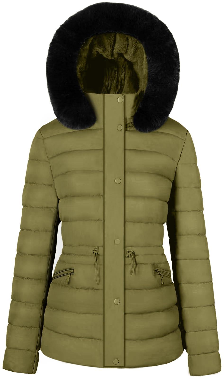 - FEATURES: This classic faux fur hooded puffer down coat features zippered slanted front hand pocket, full zip up closure and elastic cuff, detachable faux fur hood and flannel lining. Available in Black, olive, navy, chocolate, camel, mustard, burgundy and lilac.