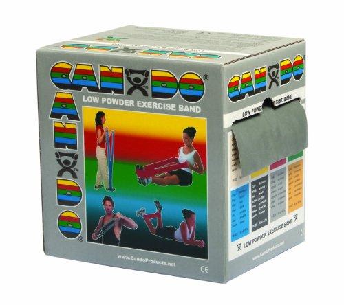 The CanDo Low Powder Exercise Band, 50 yard roll, Silver: XX-Heavy is conveniently packaged in a dispenser box. Simply unroll the desired length of exercise band from the box and cut with scissors to customize your resistance training workout. CanDo low powder exercise bands are made of natural rubber latex, which may cause allergic reactions. For those with latex sensitivities, there are latex-free alternative offerings of CanDo exercise bands. Each CanDo band is 5" wide and can be used with any band or tubing accessory to customize your workout. TheraBand colors licensed by Goldberg from Hygenic Corp without endorsement.