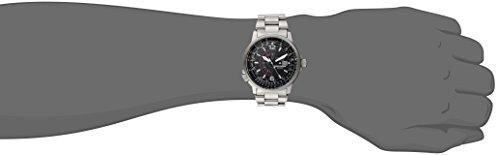 A serious timepiece for the serious watch collector, the Citizen BJ7000-52E stainless steel men's watch offers powerful timekeeping functions for your favorite aeronaut. The large round watch case measures approximately 42mm in diameter. It has a thin silver bezel that houses a black dial with a pilot's inner rotating slide rule bezel, which is operated by the secondary crown at 8 o'clock. It has large luminous hands and markers for readability and low-light visibility and dual time (GMT) capability. The triple link bracelet band is composed of brushed silver stainless steel pieces, and it's joined by a push-button folding safety clasp. Other features include a water resistance to 660 feet (200 meters), low-charge indicator window, power saver function, and a scratch-resistant, non-reflective mineral crystal.