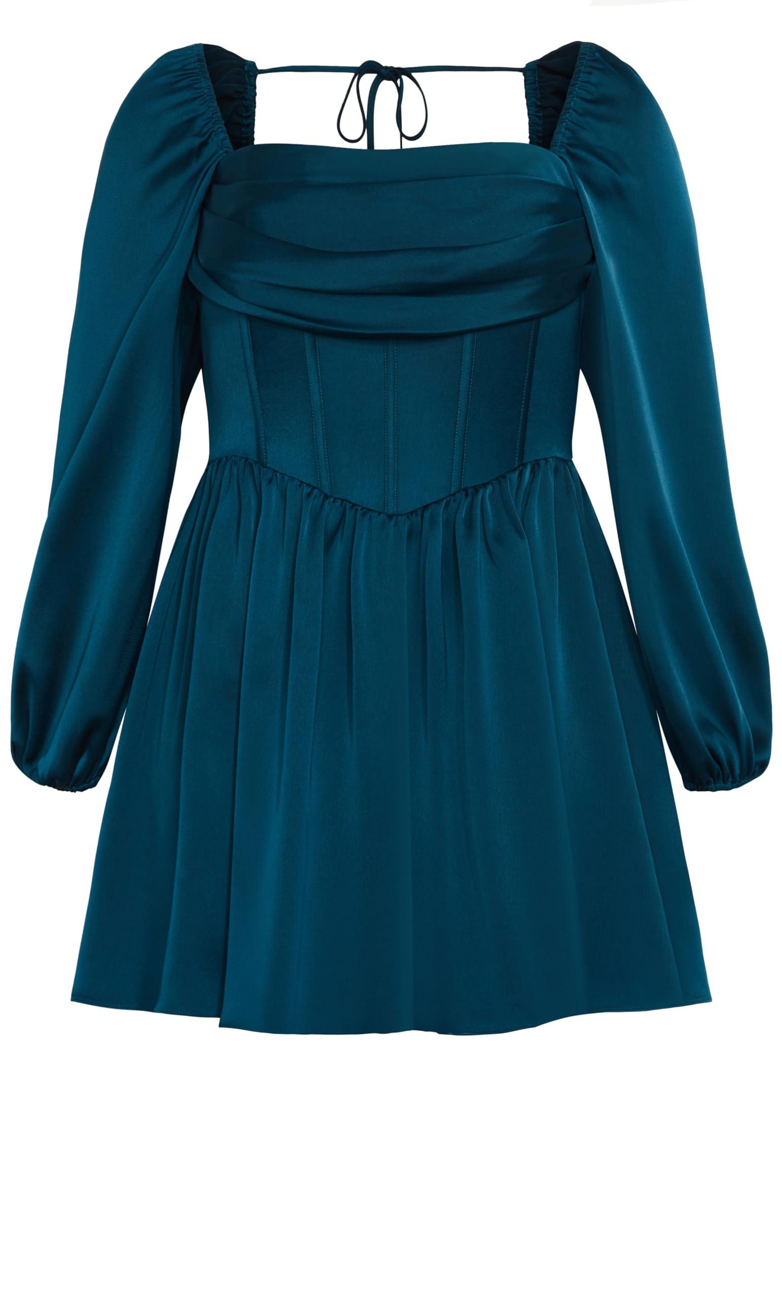 Let your style do the talking with the Flirty Corset Dress! The square neckline and back tie string detail create a silhouette to die for, while the long balloon sleeves with elastic shoulders and cuffs add a playful touch. Key Features Include: - Square neckline - Back tie string detail - Long balloon sleeves - Elastic shoulders and cuffs - Light boning to bodice for shape - Gel lining on bust and back - Invisible zip closure - Pull on style - Lined skirt - Mini length Style with platform heels and smoky eyes.