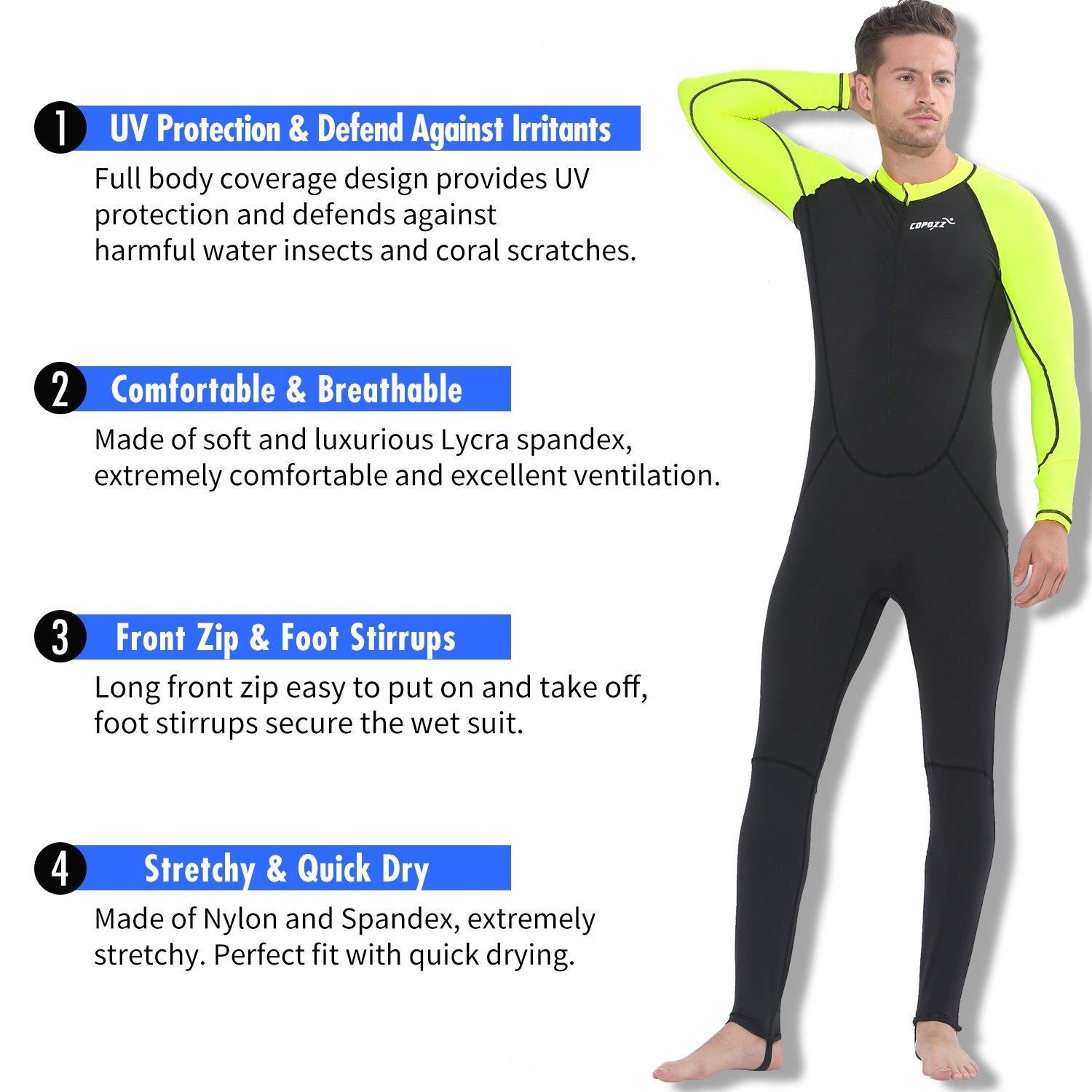 - Full Body Coverage DesignFull body cover diving skin provides the best protection against sea lice, jellyfish, coral reef and other biological irritants. Perfect to wear in the ocean or any other water area. No more bruises and stings just wonderful diving experience. You can wear it alone in summer and wear it under your wetsuit when it's cold.
