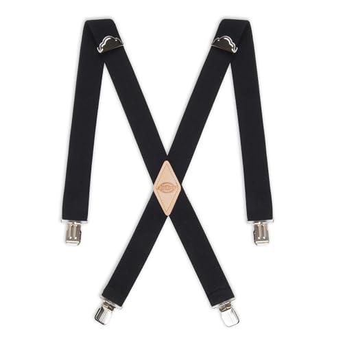 - FULLY ADJUSTABLE: These classic solid suspenders are 1 1 by 2"wide. They feature an embossed leather patch with the Dickies logo. One size fits up to 42. We also have an extended size for Big & Tall.
