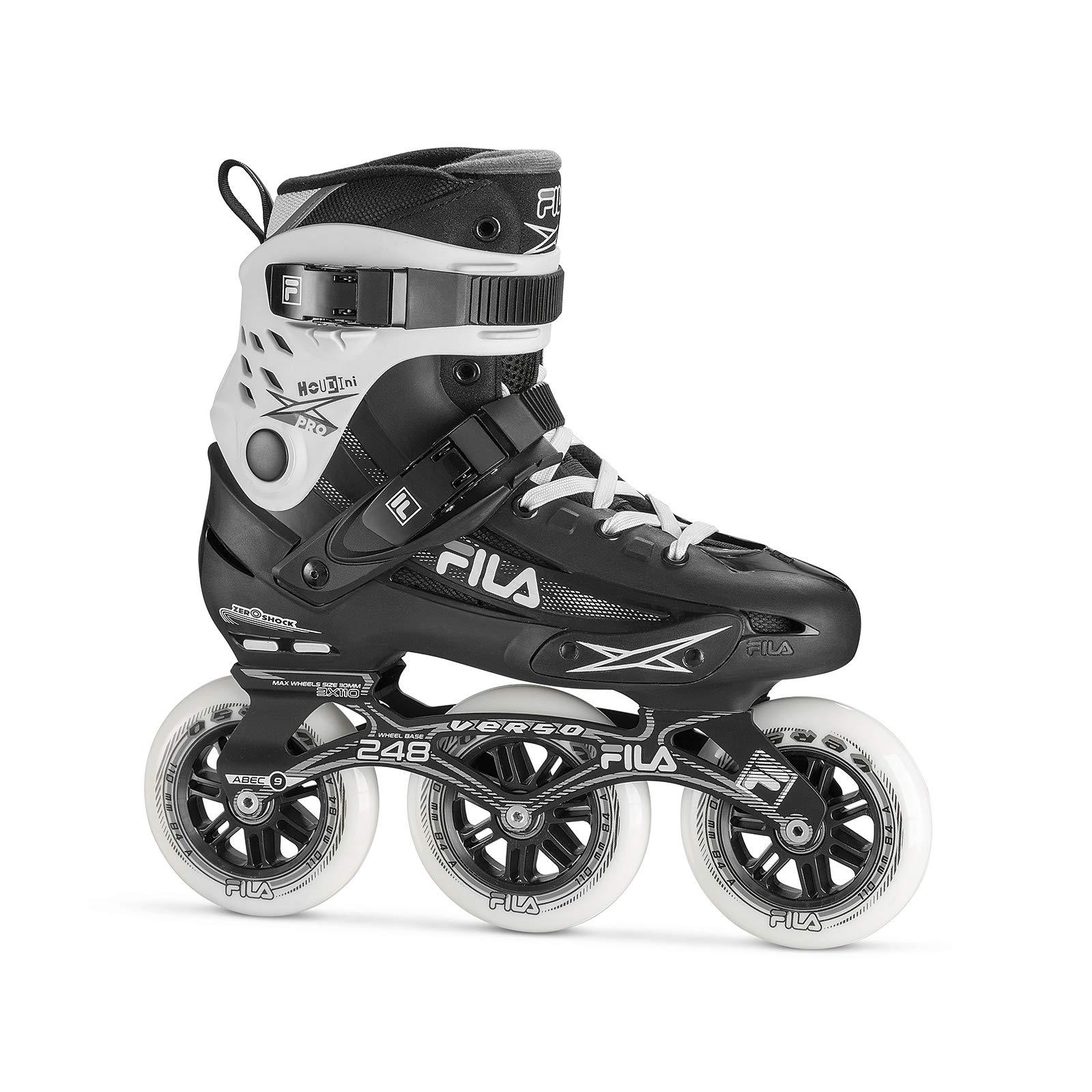 Experience a blend of stability, speed, and comfort with the FILA Houdini Pro 110MM Inline Skates. Designed for fitness enthusiasts who love high-speed training and executing spins, these skates offer a high-performance fit with pre-shaped anatomical padding that keeps your ankle securely in place. The Zero-Shock insert positioned in the heel area provides excellent cushioning and shock absorption, ensuring a smooth ride every time. The lightweight, durable 6000 series aluminum frame features 3 x 110mm wheels and ABEC 9 bearings, delivering exceptional speed and control. The high cuff and composite shell provide strength without added weight, making these skates ideal for long-lasting use. The closure system, which includes laces, a cuff lever, and a micro-adjustable lever on the instep, ensures a secure, stable, and precise fit. Ideal for recreational or fitness-style skating. Feel the wind in your hair and elevate your skating experience with these top-of-the-line skates from FILA