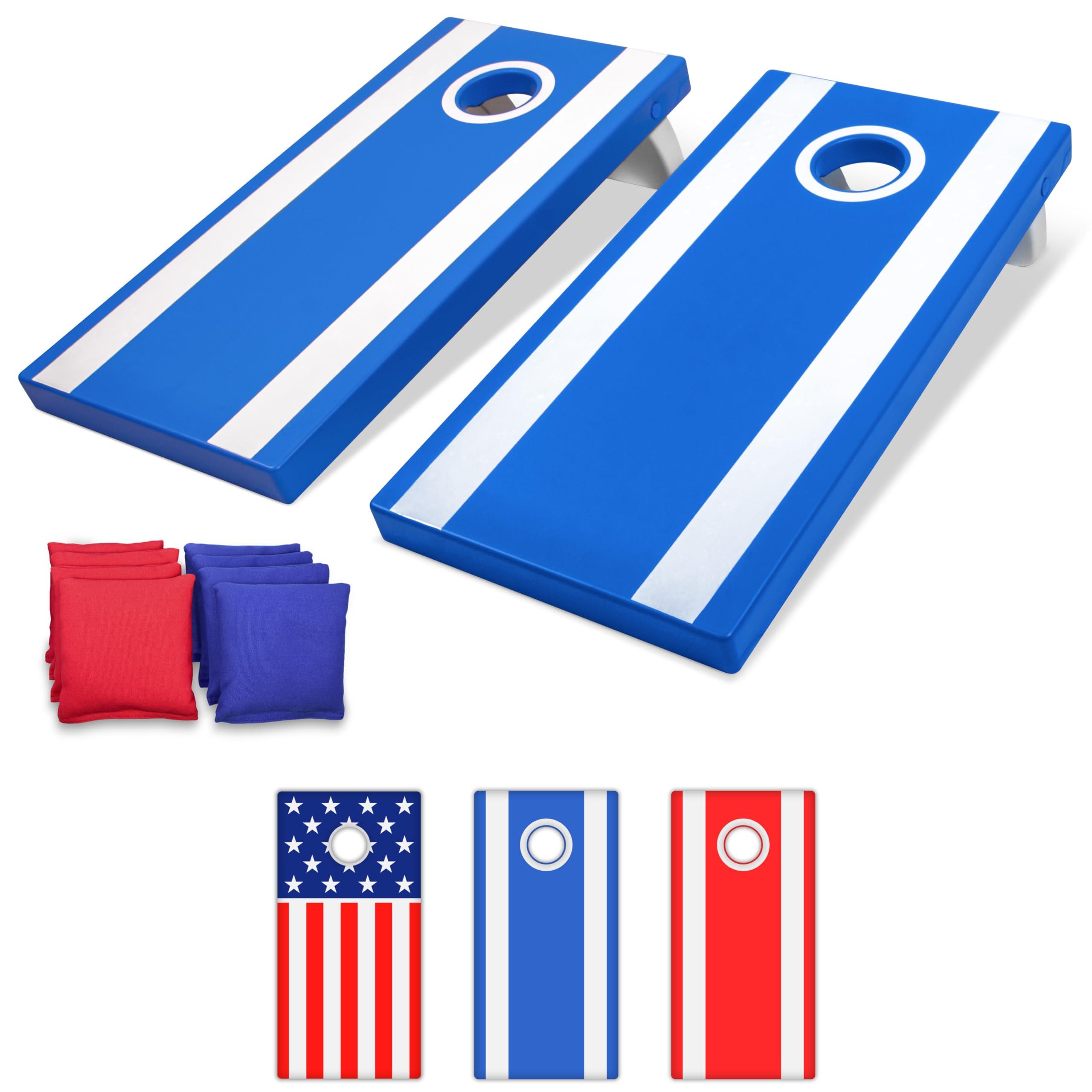The GoSports All-Weather Cornhole game set was designed to provide for a superior cornhole experience by maximizing durability, portability, and game quality. The 4 ft x 2 ft boards are full regulation size for authentic gameplay, but they are made from durable yet lightweight hard plastic to make them portable. Premium materials help make this set a leader in the cornhole market in terms of durability and price. The set also includes 8 all-weather duck cloth bags, not the cheap sand filled bags other companies use that feel like bricks. Our boards are also unique in that the base leg folds in for easy portability/storage, but this does not affect gameplay in any way. All the bags can be stored inside the folded boards when not in use. Choose from our fun patriotic American Flag design, or classic Red and Blue designs.
