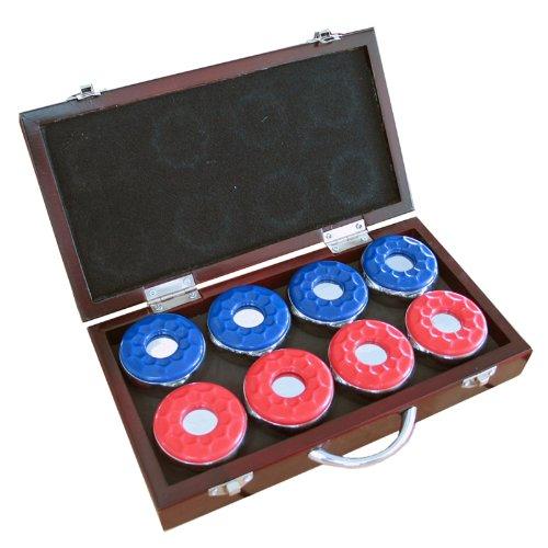 Our shuffleboard pucks are delivered in a handsome sturdy wooden storage case. Each box contains eight shuffleboard pucks - four red and four blue. Each puck is dimpled for easy grip and beveled for maximum control. These 2.125-in diameter pucks, each weighing 9.5-oz, will sail across your table.