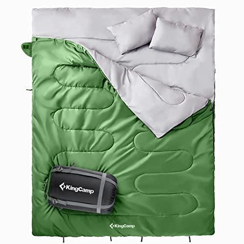 ?QUEEN SLEEPING BAGS?KingCamp double sleeping bag is perfect for couples camping. This adult sleeping bag measures 59"W x 86.6"H, big enough for your toss and turn. KingCamp 2 person sleeping bag allows plenty of room for both legs and arms to stretch out; can be completely unzipped and used as a comforter or mat. Provides a queen size roomy experience, similar to sleeping in your own bed at home.