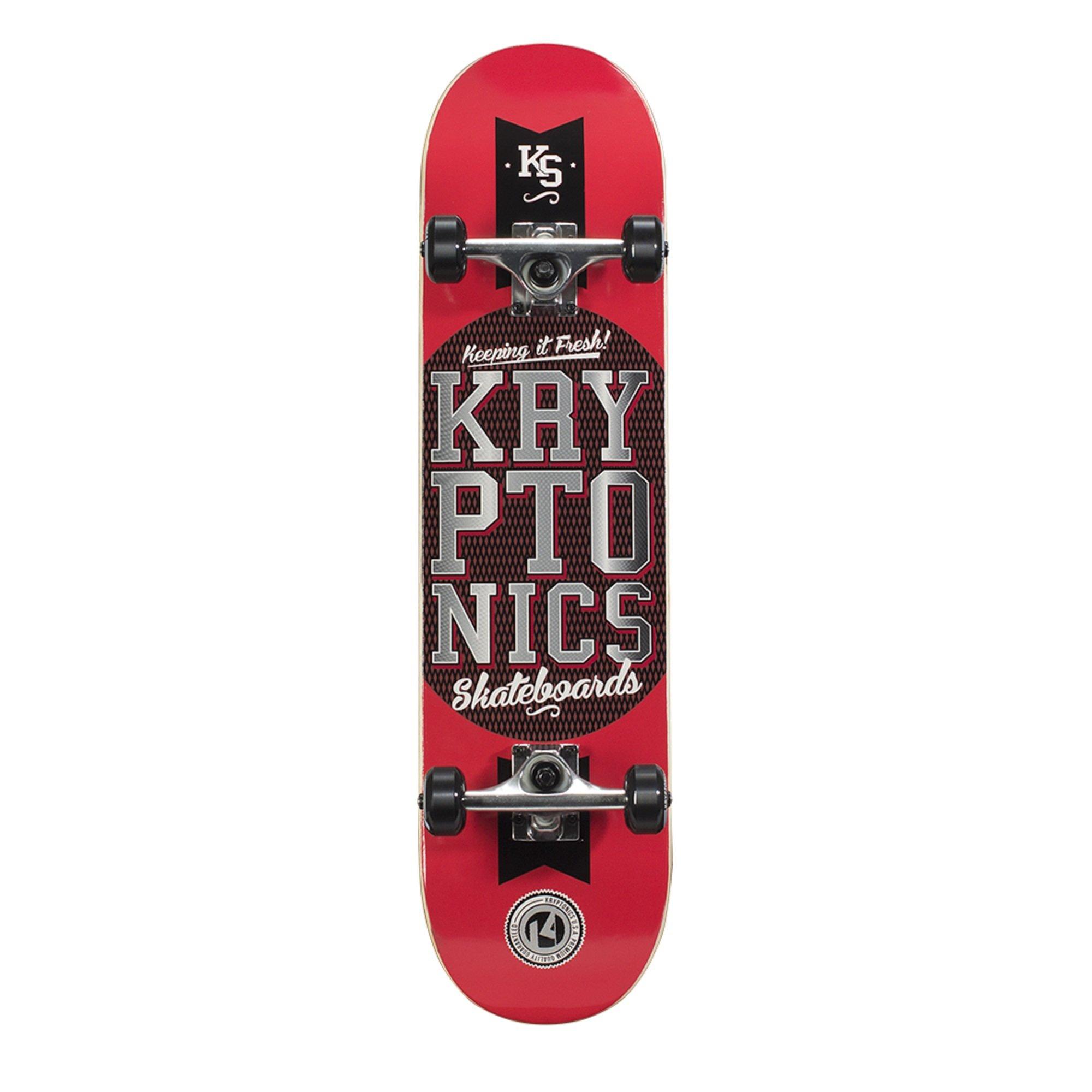 The Kryptonics Pop Series 31-Inch Complete Skateboard is perfect for anyone who wants to try out longboarding but isn't ready for the classic longboard length. This board's 7-ply mixed maple wood deck measures 31 inches long and 7.75 inches wide, offering excellent space for sure footing. A double kick tail design provides a higher level of control, allows for a wide range of tricks, and a way to brake easily - using the front or back of the board, making it perfect for a novice still gaining balance and confidence, or a more experienced rider who still isn't quite tall enough for a bigger board. The 5-inch heavy duty aluminum "orbit" trucks with polished finish and polyurethane-injected bushings supply the speed associated with longboards and makes the board able to sustain a higher weight limit than standard skateboards. The all-black top deck gives the board a classic design, while the light and dark blue retro Kryptonics logo on the bottom provides a vintage California long boarder look. The deck features 80AB grip tape to hold feet in place while the 54mm x 34mm polyurethane-injected wheels with carbon steel ABEC-5 bearings ensure a smooth, shock resistant ride. Recommended for ages 8 years and up, weighing up to 220 pounds.