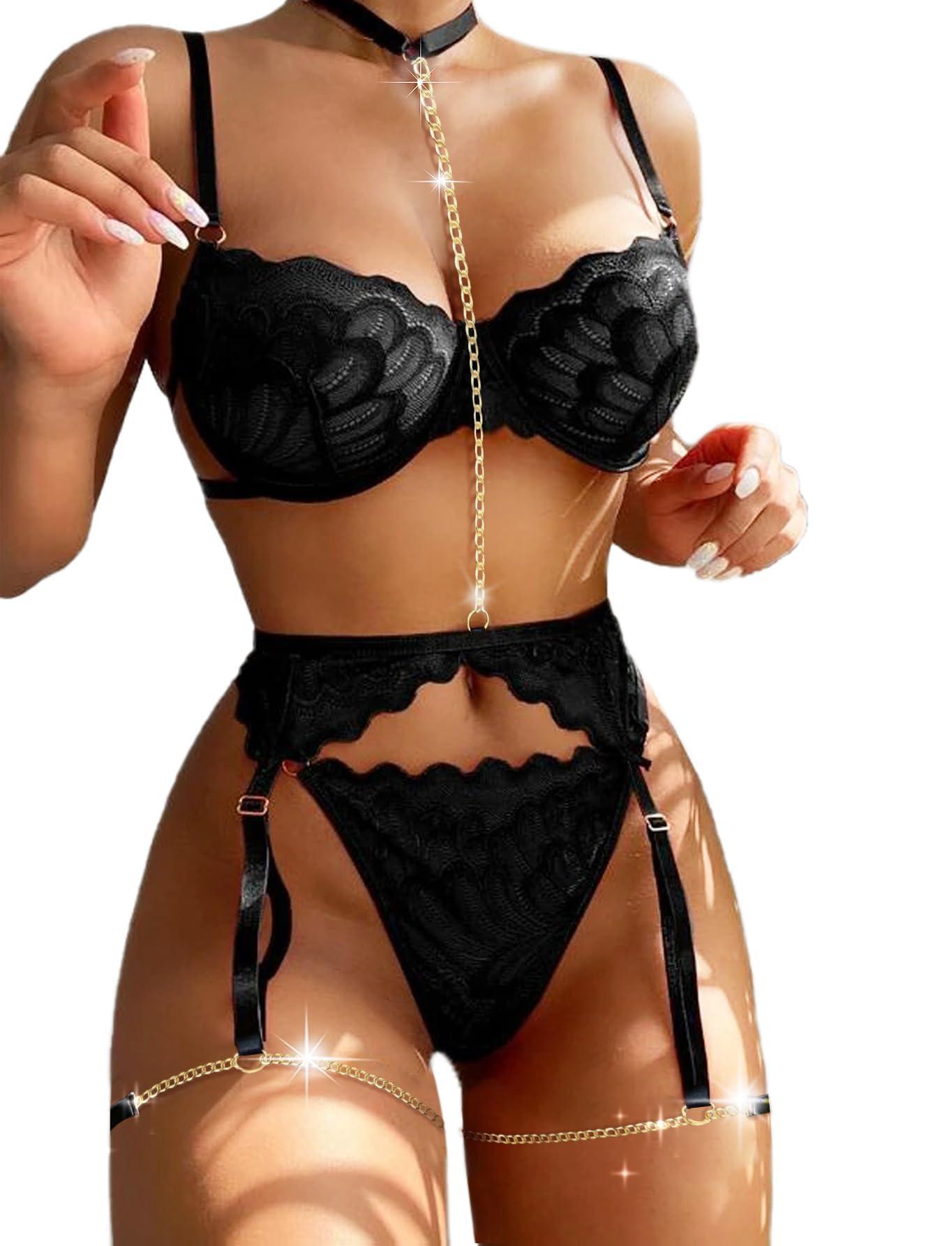 Lilosy Sexy Choker Floral Lace Scallop Sheer Underwire Push Up Garter Belt Lingerie Set for Women See Through Bachelorette Bra and Panty 3 Piece Chain Black Medium