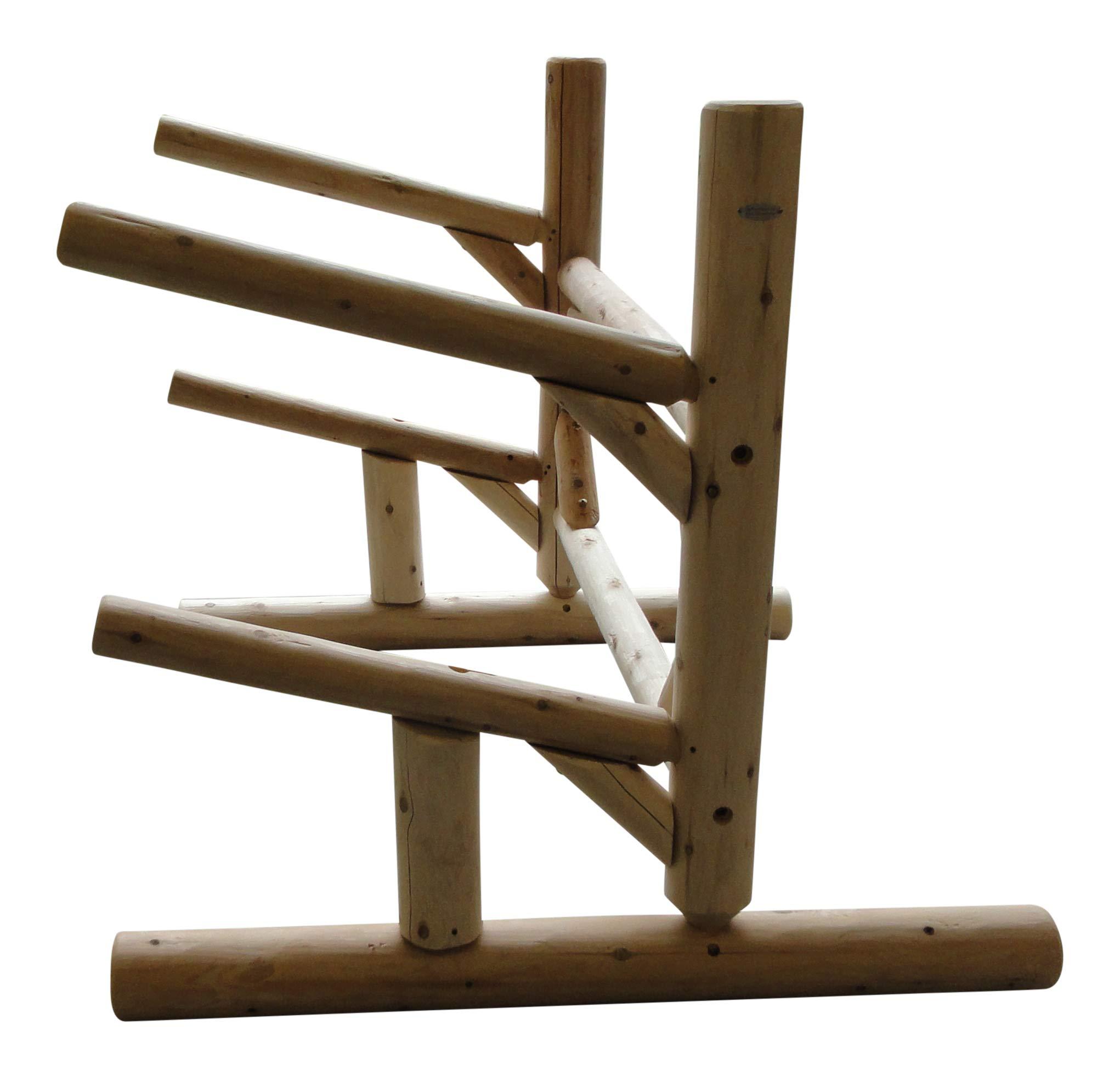The freestanding 2-Place 1-Sided Kayak/SUP Rack is built with Northern White Cedar from the Upper Peninsula of Michigan. This rack is designed for functionality and aesthetics by lake homeowners. It not only cares for and organizes your boats, but it can also be matched to its surroundings being log construction. With finishing options, you can match dock, house, etc... or let it turn silver/gray with no finish, or you can use your own finish if so desired. This rack holds the heaviest of Surfboards, Kayaks, and SUPS (Stand Up Paddle-boards). Each boat can weigh up to 100 pounds. This rack has up to a 200-pound capacity. We have worked with logs for over 23 years crafting log homes, furniture, and kayak racks. Each joint is glued and screwed for longevity. We use glued mortise-and-tenon joinery wherever possible. Hand made and finished by Log Artisans in Northern Wisconsin.