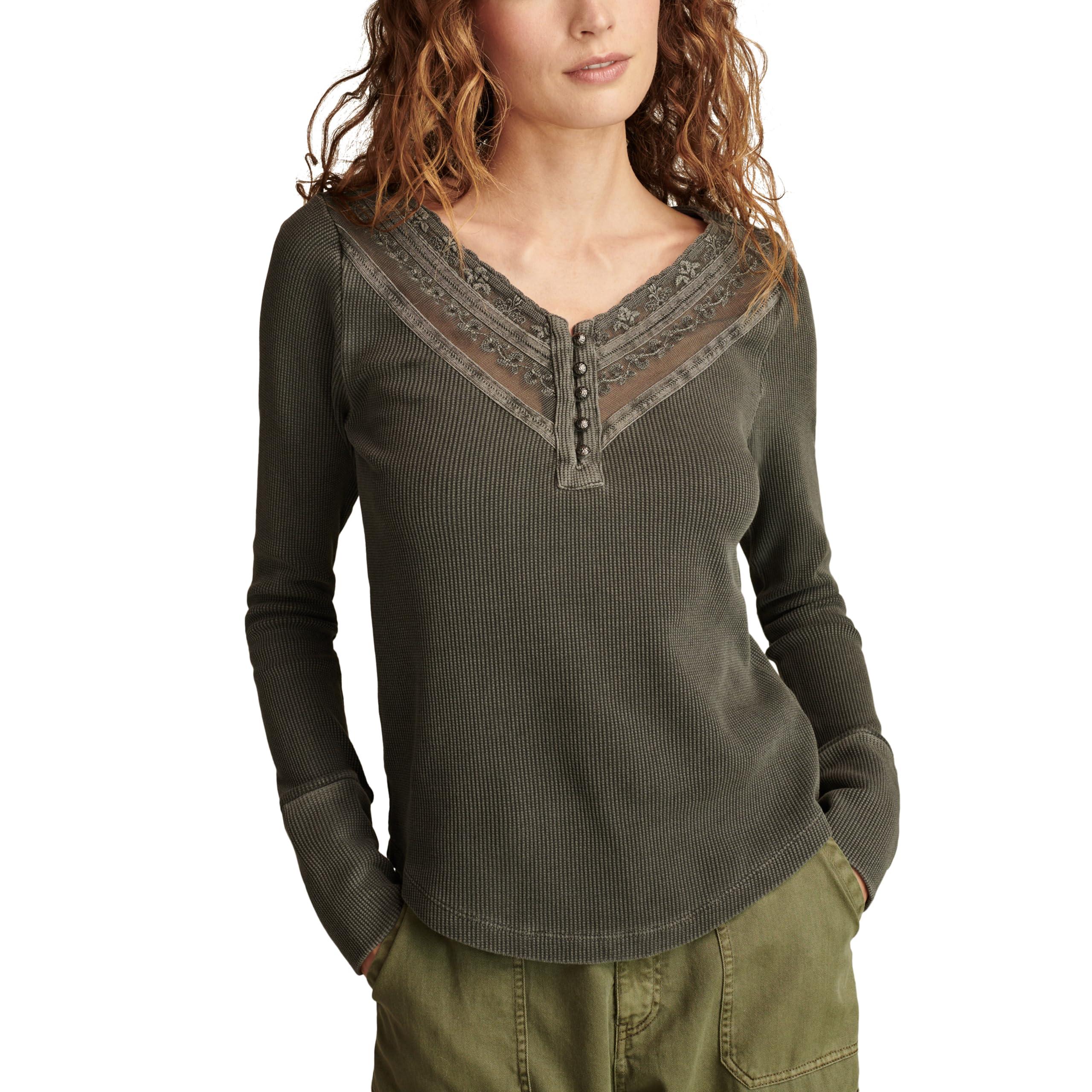 Make an easy wardrobe decision with the Embroidered Mesh Henley from Lucky Brand. Cut from soft, one hundred percent cotton, this long sleeve Henley with a button placket and mesh embroidered detailing is perfect for the week through the weekend. Paired with your favorite Lucky denim jeans, this Henley is a must-have addition to your everyday look.
