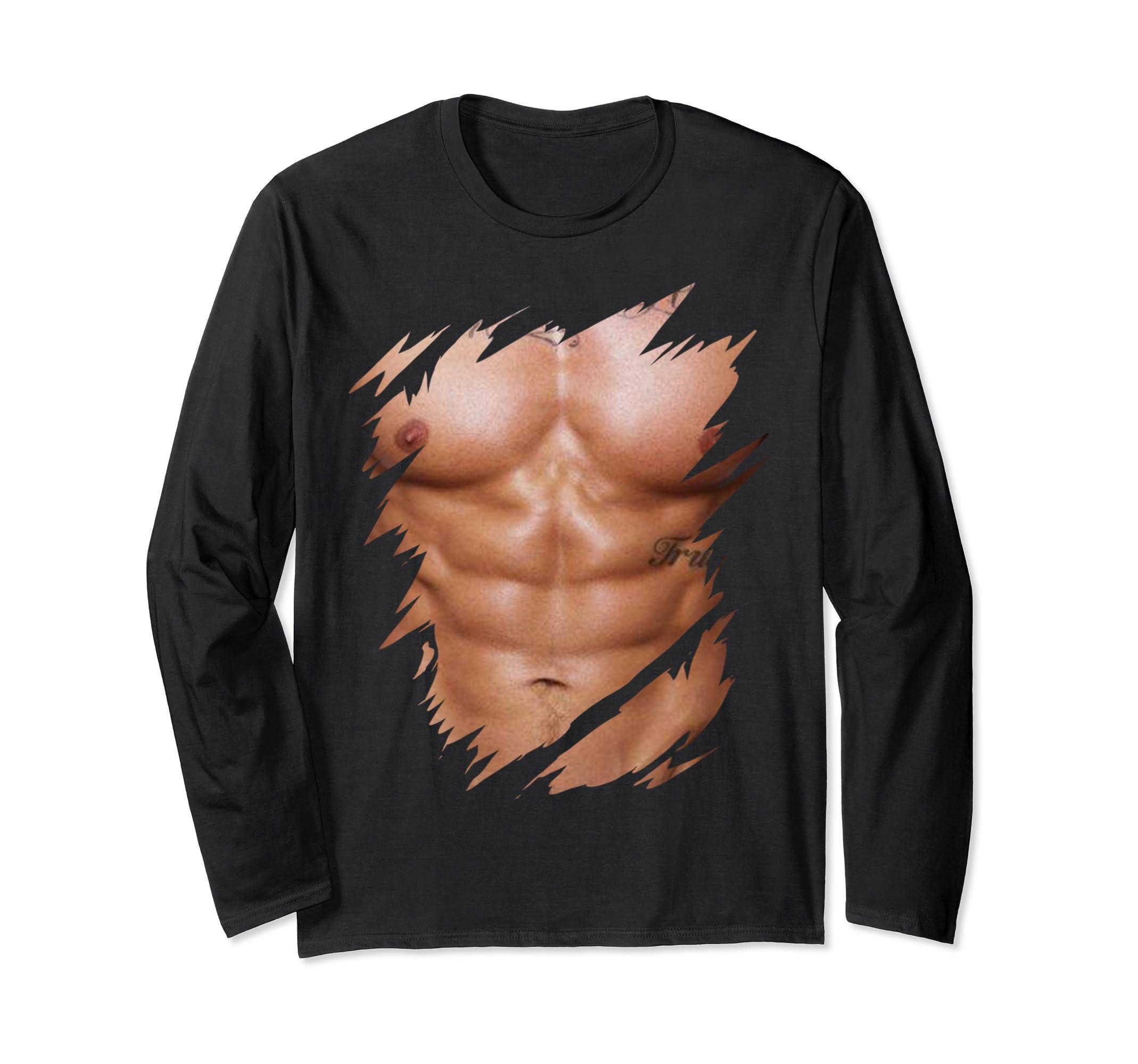- Fake Muscles Ripped Torn Chest Six Pack Abs for Men Features with a realistic ripped abs muscles design. Funny way to look strong & shredded in gym, beach or as a halloween costume, and catch everyone's eye wearing this chest six pack abs muscles.