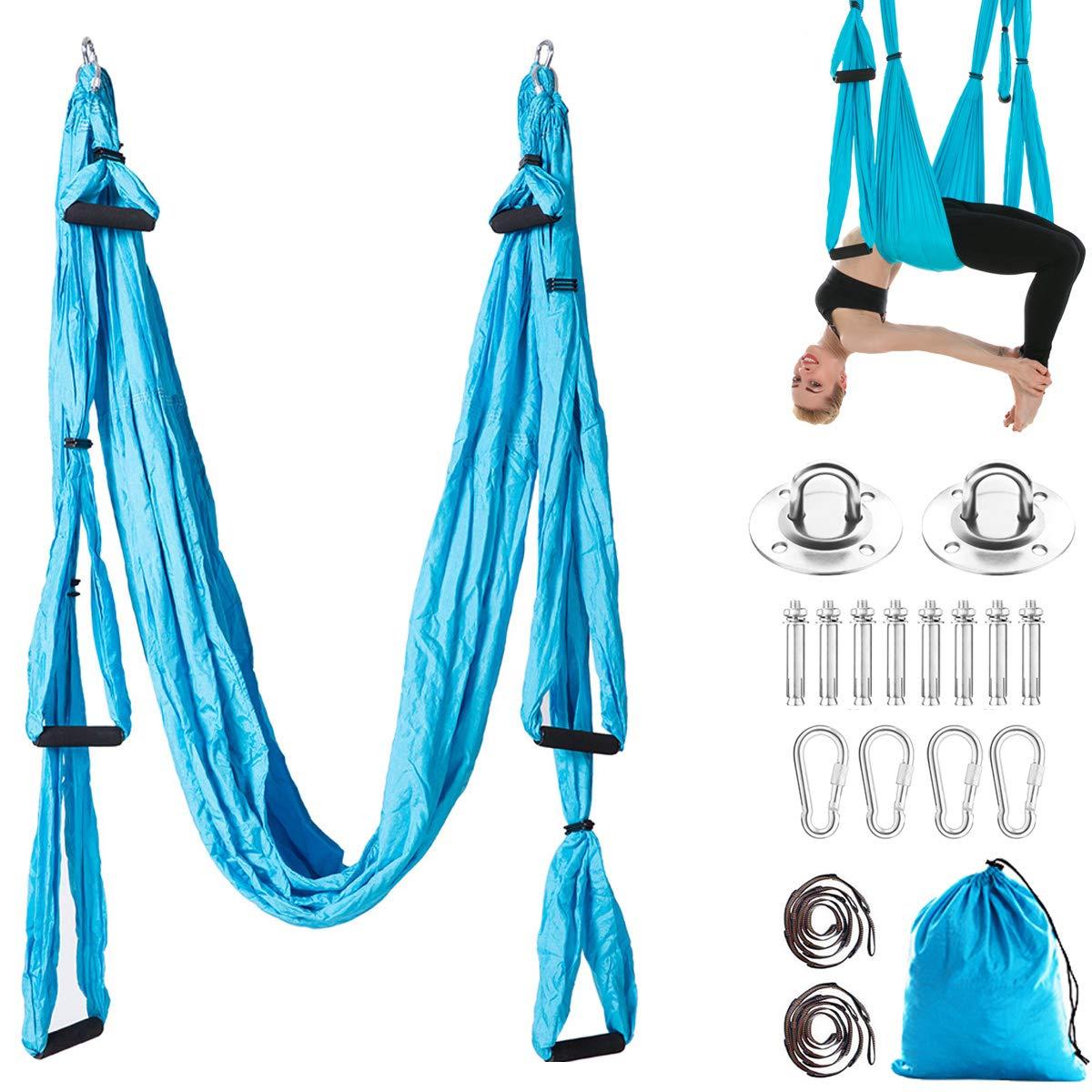 - Easy to Install & Convenient StorageAerial Yoga swing set includes 1 x yoga hammock, 4 x stainless steel lock, 2 x stainless steel hanging plate, 8 x stainless steel bolts, 2 x extension bands, all necessary parts and very easy to install. The mount can be installed in just minutes. Also this aerial yoga hammock comes with a storage bag, you can store in it after you finish using it. Convenient storage and easy to install and disassemble.