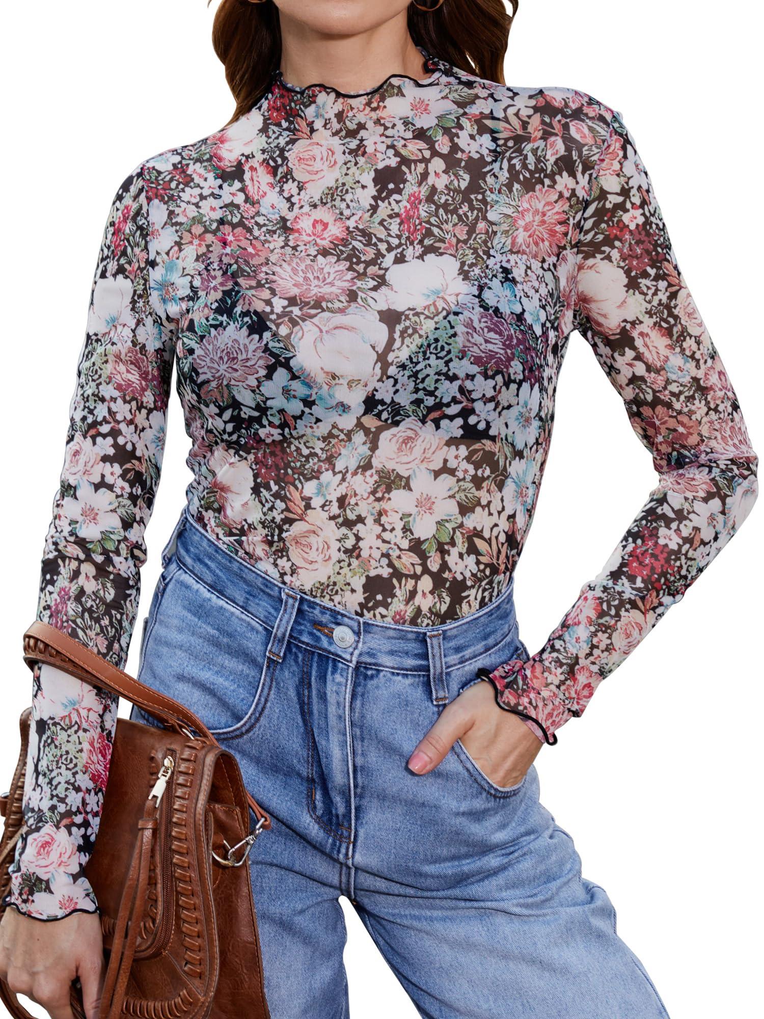 - Design: Features a chic mock neck and floral embroidery, see-through design, soft stretch lace and sexy feminine style.This sheer long sleeve top is Perfect for layering.