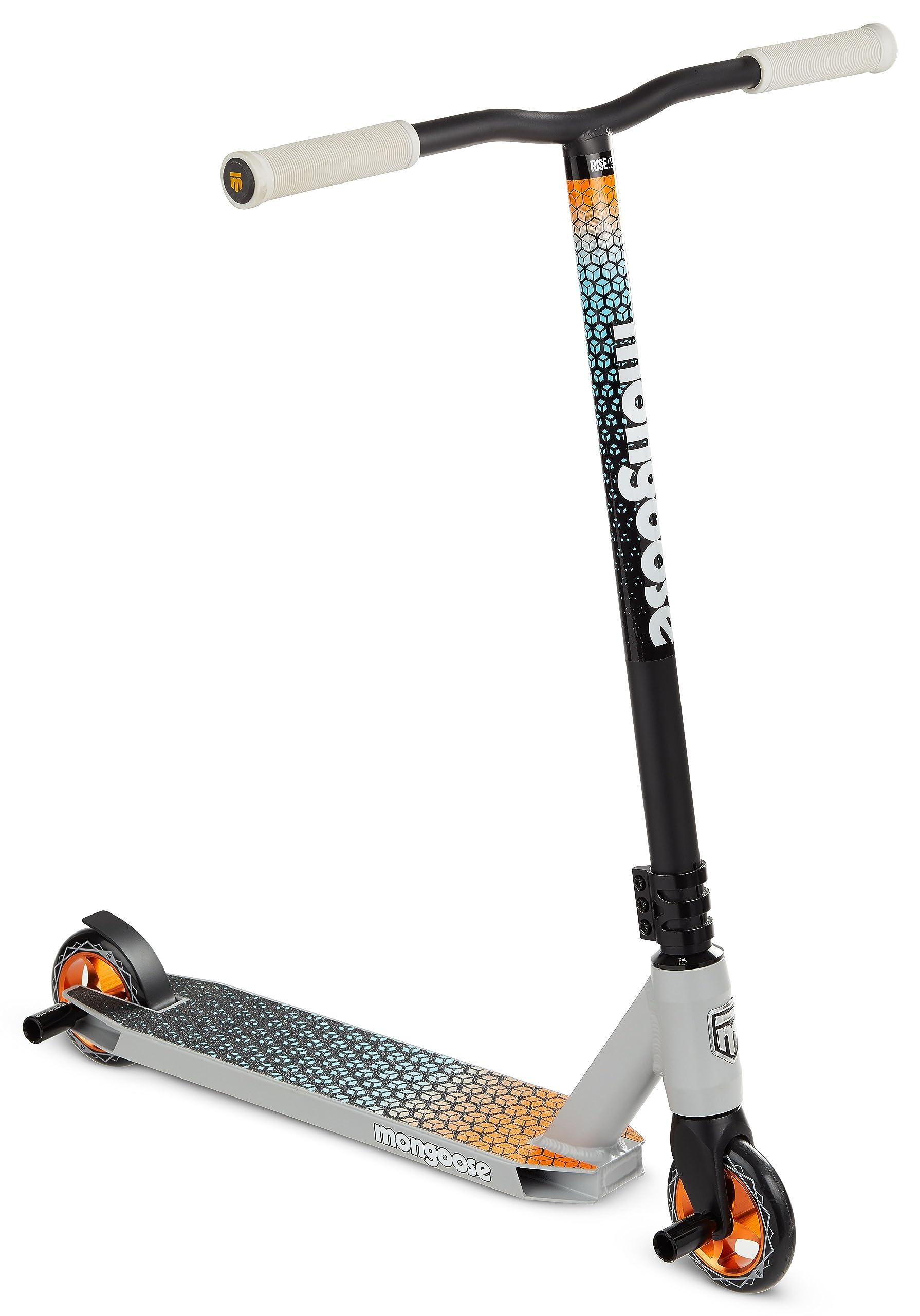 Showcase your skills at the skatepark with the Rise 110 Elite Freestyle Scooter by Mongoose. The Rise is loaded with outstanding features, including a lightweight alloy deck with extended standing area, with front and rear alloy pegs for pro-style park performance. The full-coverage MaxGrip on the alloy deck and steel brake combine with 110 mm high impact alloy wheels and durable ABEC-7 bearings to provide smooth non-slip riding. The one-piece welded steel T-bar handlebar with bike-style grips gives you the perfect combination of durability and comfort. Plus, the triple anodized CNC clamp collar, internal sealed threadless headset, and alloy fork provides precise, crisp steering wherever you go. This scooter can accommodate a wide variety of riders, as the heavy-duty frame supports children ages 8+, up to 220 lbs. Upgrade your scooter game with the Rise 110 Elite Freestyle Scooter. Theres nothing you cant do on a Mongoose.