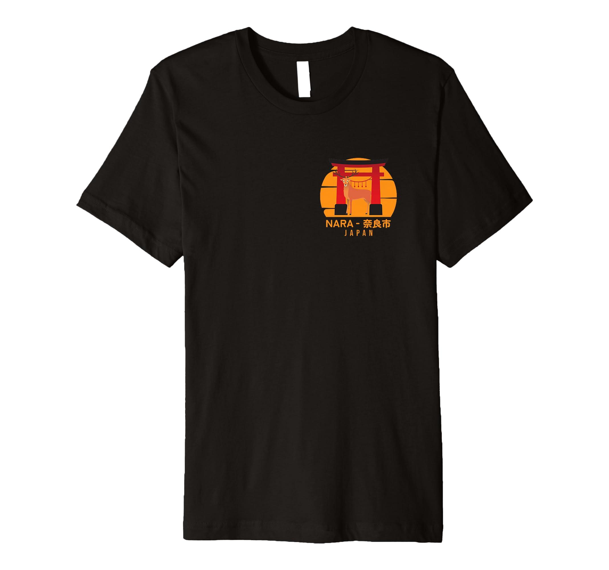 - Stylized design featuring a majestic deer in front of a traditional red Torii gate, representing Nara, Japan, with bold text in English and Japanese.