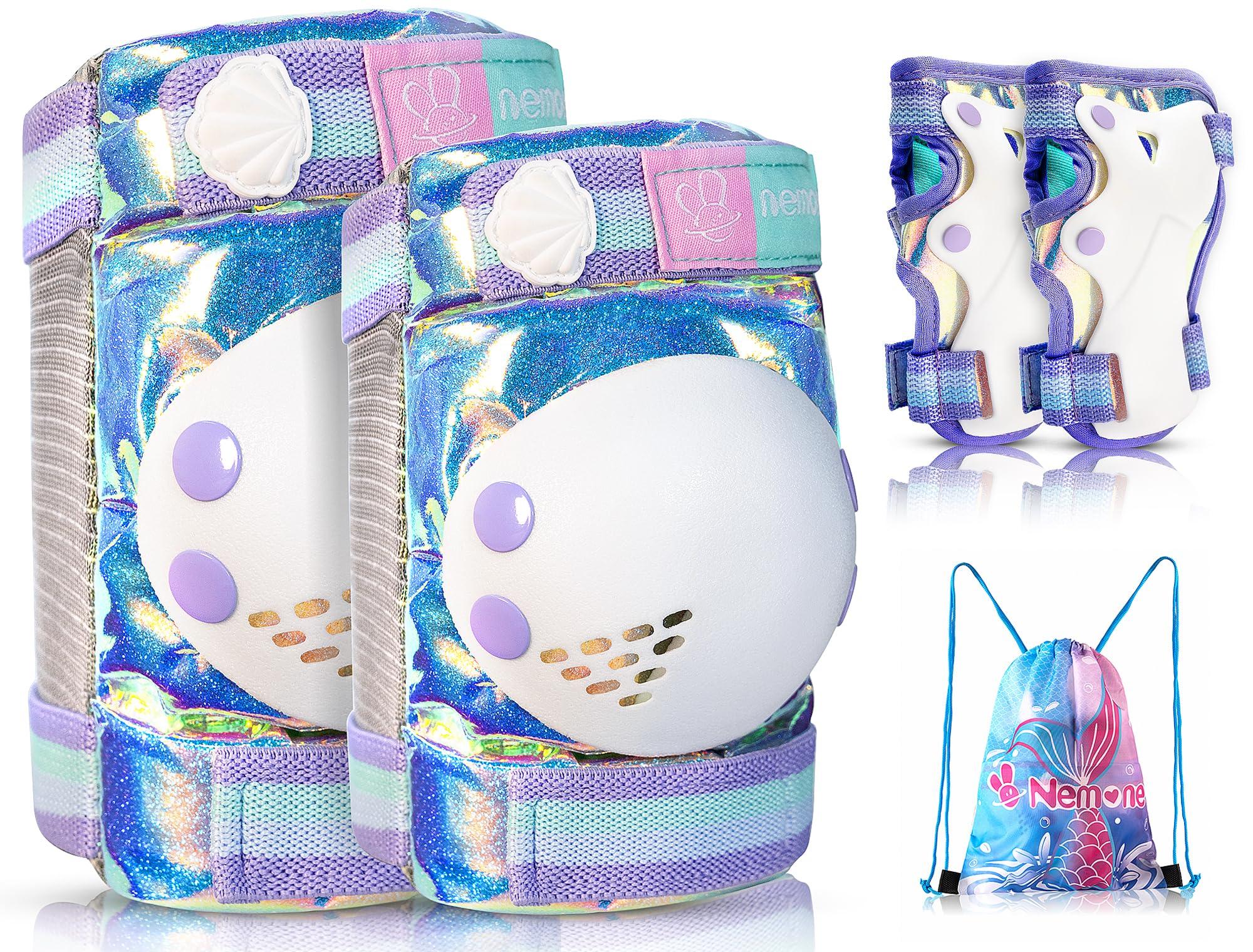 NEMONE Mermaid Knee Pads for Kids, Girls Boys Knee Elbow Pads Wrist Guards with Drawstring Bag, Adjustable Reflective Protective Gear Set for Roller Skates Bike Cycling Skateboard Scooter