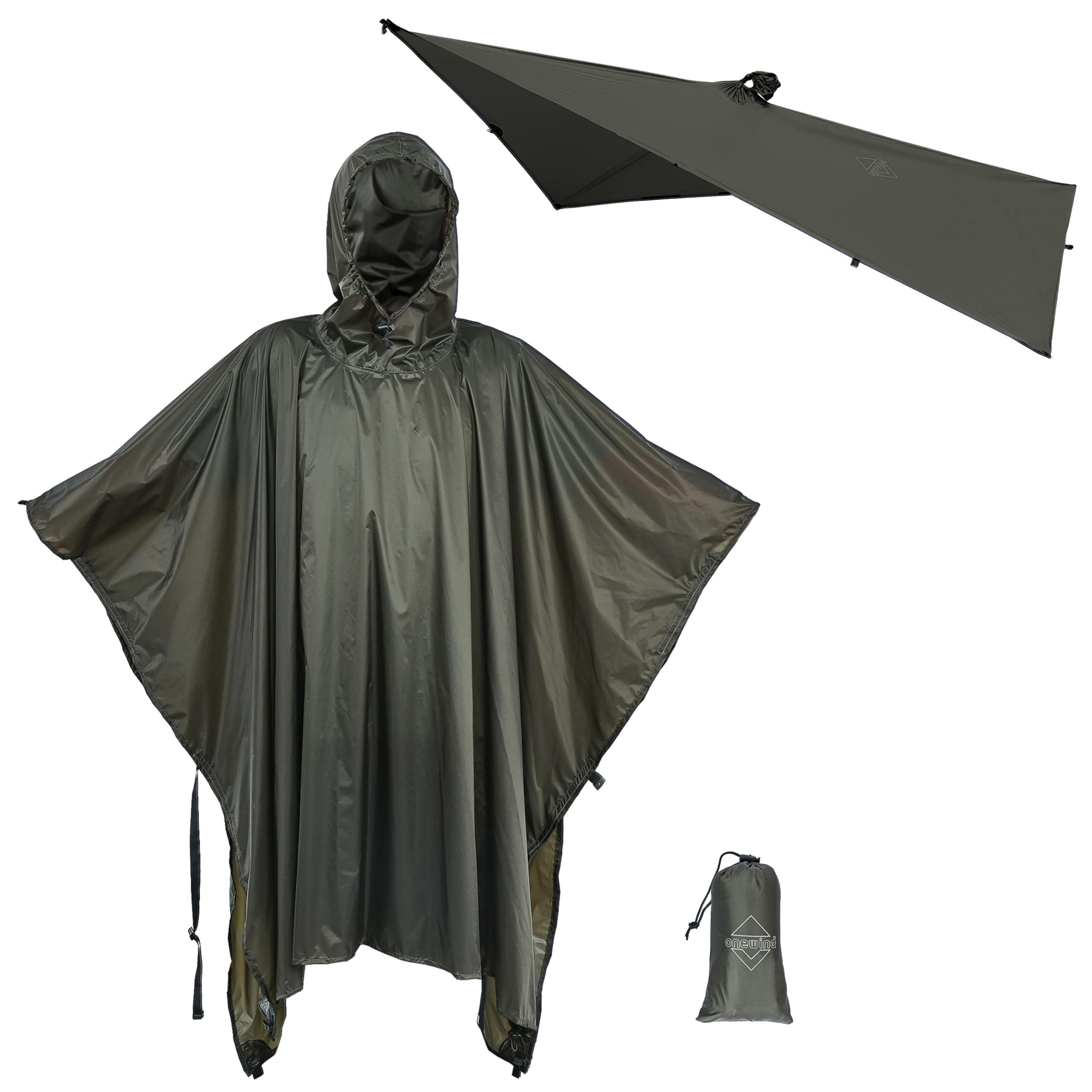 - DURABLE AND RELIABLE. Whether you are heading out for a backpacking trip, hiking, fishing trip or camping, make sure that you stay dry and comfortable with Onewind's Rain Poncho for adults. It's made from 1.1oz Silnylon Ripstop with PU coating for 3000mm waterproof rating and tear-resistant so you can get the most out of this rain gear.
