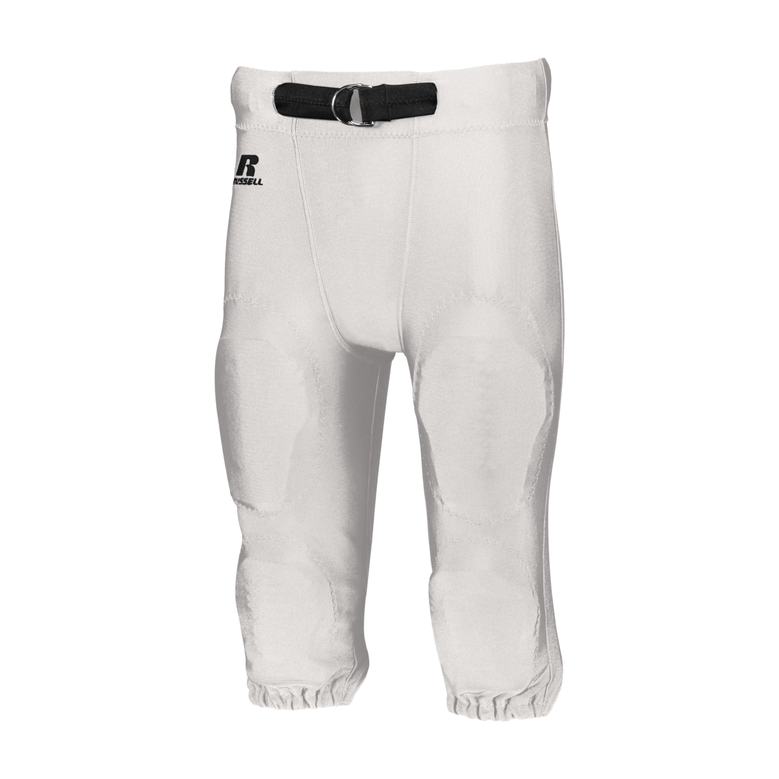 The Russell Athletic Youth Deluxe Game Football Pant (Style # F2562W) is designed for young football players seeking both durability and flexibility on the field. Made with a blend of 92% nylon/8% spandex for colors and 92% polyester/8% spandex for white, these pants offer a comfortable, yet snug fit. They feature a 2 1/2 slotted elastic waist with gripper technology to keep the jersey securely tucked in. The no fly front and envelope thigh and knee pad system ensure pads stay firmly in place, providing both protection and ease of movement. Elastic cuffs complete the design, making these pants suitable for intense football gameplay.