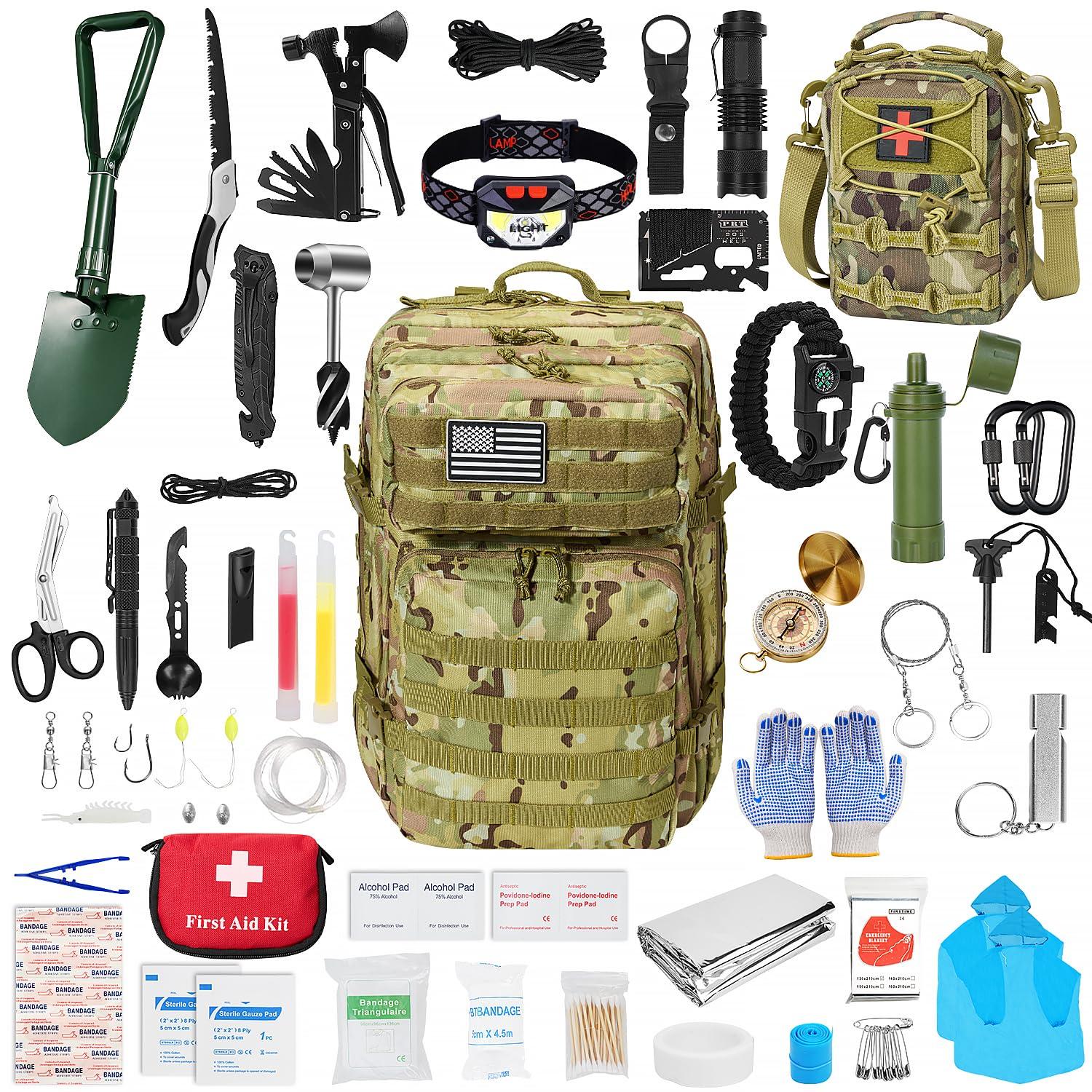 - Practical Survival GearThis kit includes the most popular survival accessories: a multifunctional axe, a 3-mode flashlight, a carpenter's drill, a folding saw, a multifunctional card, a survival bracelet, a whistle, a wire saw, a paracord, an emergency blanket, fire-starting tools, fishing tools, a comprehensive first aid kit, and more. All of these gears ensure that we have the basic survival essentials in the outdoors.