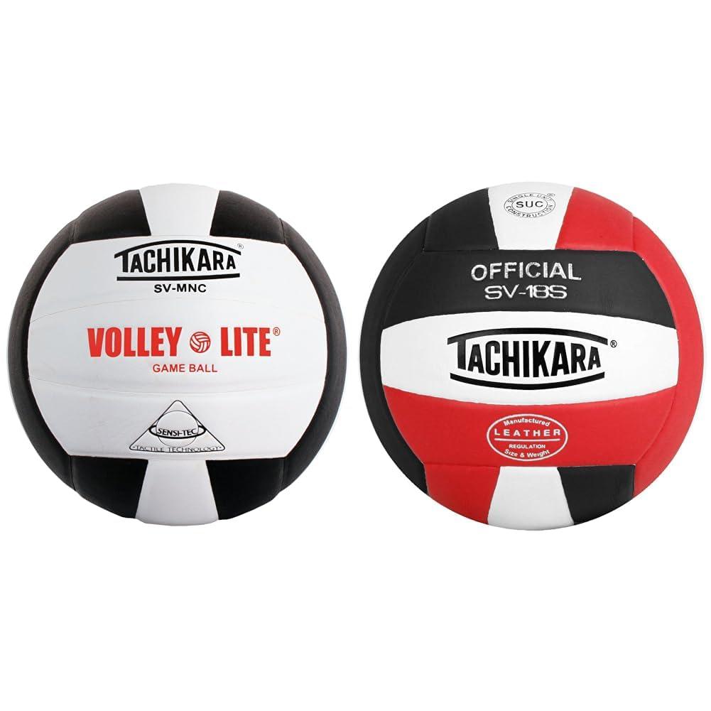 The Tachikara Volley-Lite Additional Colors and Tachikara SV18S Composite Leather Volleyball bundle combines a lightweight training volleyball and a durable composite leather volleyball for a variety of skill levels. The Tachikara SV-MNC Volley-Lite is a 25.6" to 26.4" regulation size volleyball weighing 25% less, only 7 to 7.7 oz. The lightweight Sensi-Tec microfiber composite leather cover allows beginning and youth players ages 12 and under to start developing their volleyball skills. With Single Unit Construction (SUC) and a butyl bladder, it provides a lighter ball with the look and feel of a leather volleyball. The Tachikara SV18S is a traditionally constructed composite leather volleyball built for high durability during institutional use by multiple players. The white and team color options feature a woven-fiber "V100" composite cover reinforced with cotton for a soft yet consistent touch during play or practice. It uses the same Single Unit Construction as the Volley-Lite and ships deflated with inflation required before use.