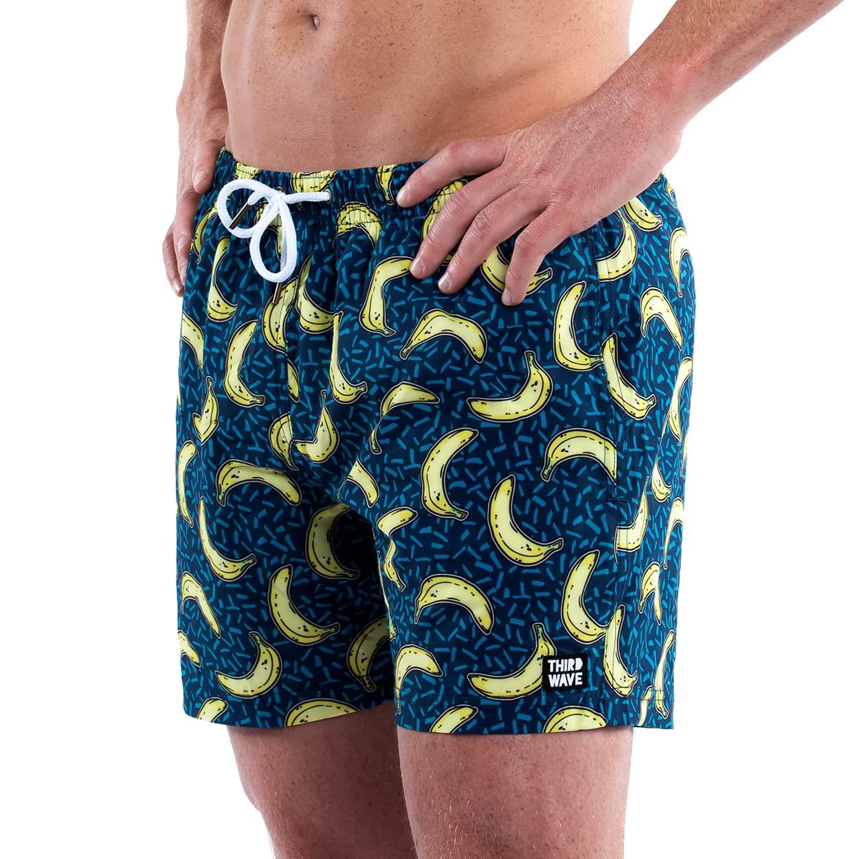 Third Wave 5 swim trunks are made with stretchy polyester spandex fabric that feels great and looks good. They have a mid thigh design, fitted look, and feature stylish patterned prints. The built in brief liner is made of soft mesh that is super comfortable and adds support and privacy. The elastic waist and drawstring guarantee a great fit. With deep side pockets, coin pocket, and zipper back pocket theres plenty of space for your stuff. And, the pockets are mesh lined for quick drying. Quality details include metal tipped drawstrings, metal eyelets, and a strong zipper on the back pocket.