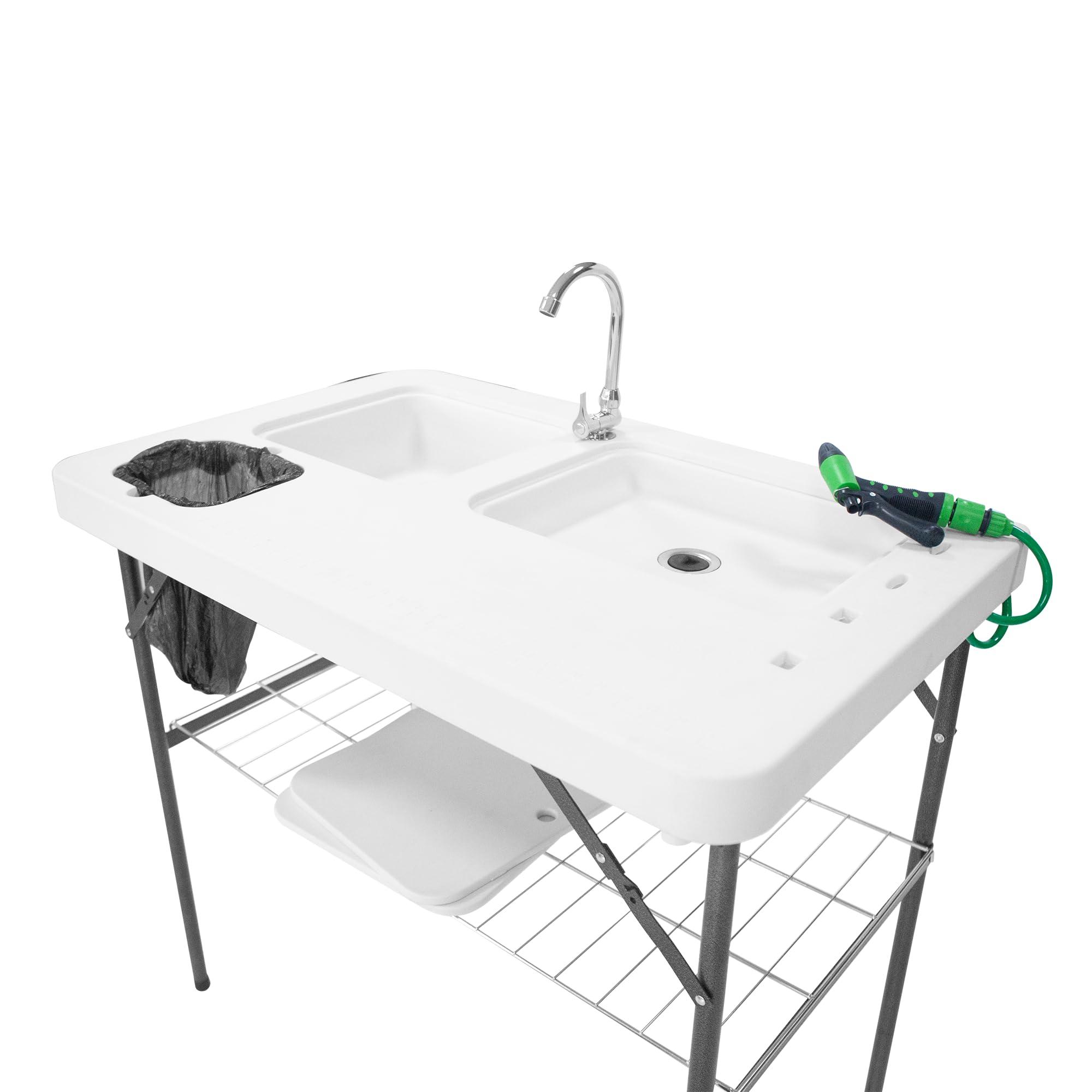 - MULTIPLE USAGE. Camping table with sink is perfect for picnic, camping, fishing and almost any kind of outdoor activity with family and friends. More importantly, this fish cleaning table can be widely used for cleaning different meats, fish, fruits and vegetables. Besides, our fish table is ideal for sellers to process and clean fish or meats