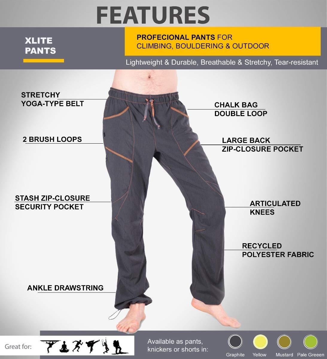 - Designed for Maximum Performance - These climbing pants are engineered by climbers for optimal functionality. Lightweight, stretchy, and durable, they feature adjustable waistbands, 4 outer pockets (2 zippered), and convenient chalk bag & brush loops.