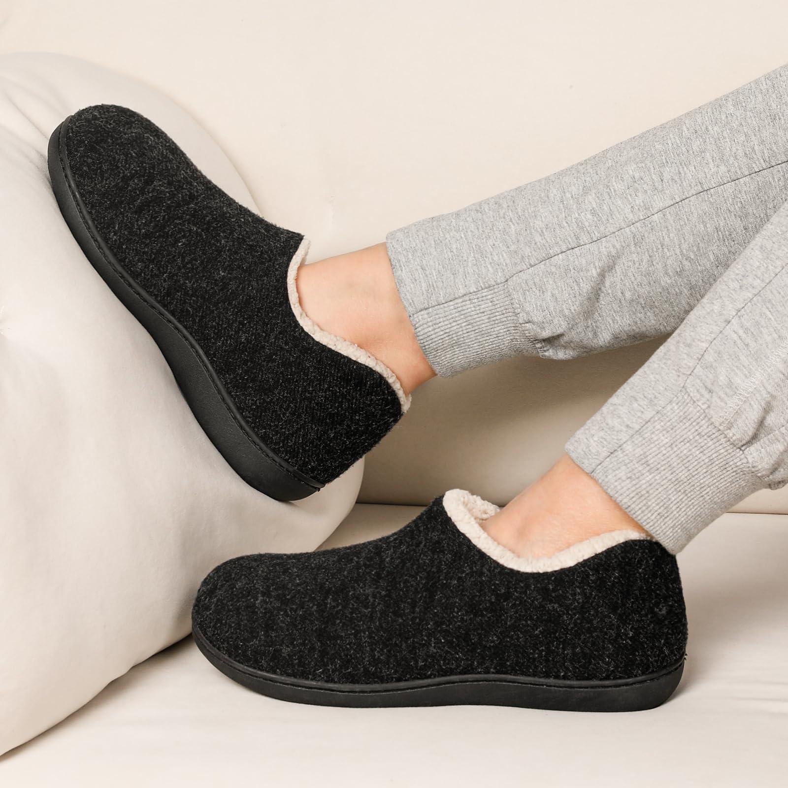 - COMFY WOOLEN BLEND COTTON UPPER for ultimately breathable along with closed back heel keep warmth in. These house slippers provide good all-around coverage of the whole foot while still have enough elasticity to fit them well, little to no clunky feeling when walking on hard surfaces.