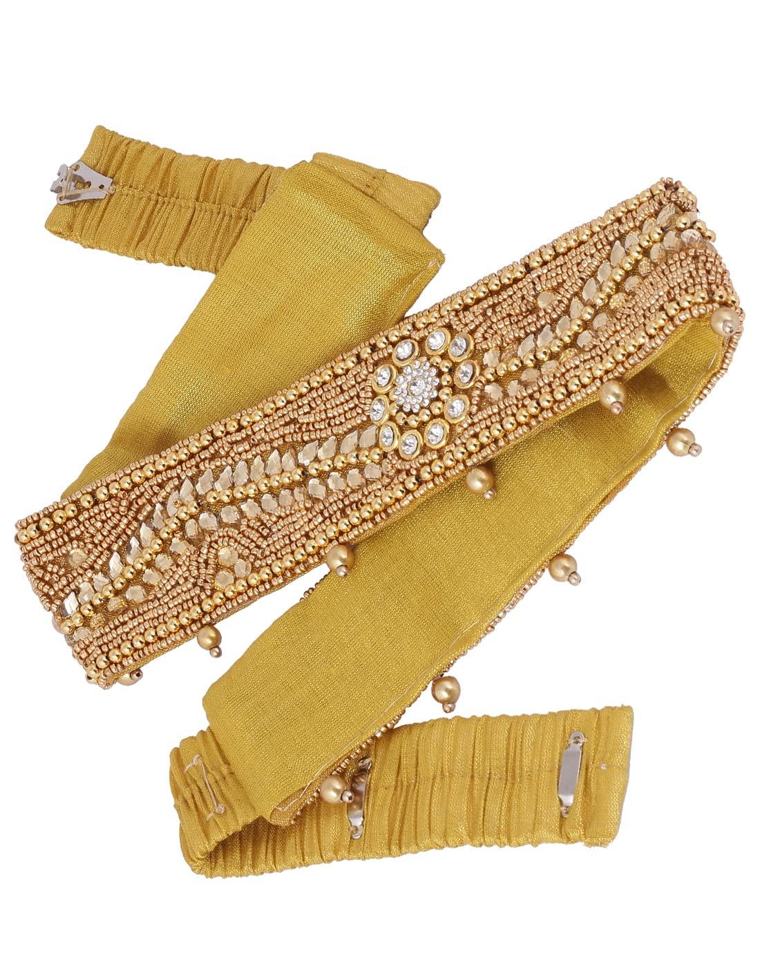 This Traditional Cloth Saree Belt chain Kamarband Kamarpatta size 30-40 inches only is an accessory that adds charm to the Waist women's Body. For ages, it has ruled the fashion world with its beautiful designs and our Kamarband completely elegant look for Half Sarees Tips To Style Kamarbandh The Right Way. First of all you should figure out what type of waist belt for women will go well with your outfit, color, and pattern. If your outfit has golden embroidery or a combination then go for Cloth belt kamarpatta jewellery. If your Saree or Lehenga has heavy embroidery work try to go for a simple waist belt Chain. If your outfit is simple, then opt for three layered or two-layered Traditional Cloth Kamarband Belt to add up light to your look. Make sure you go for a broad Belt Tagdi unless it is a very important ceremony that you attending. To keep it simple yet elegant go for pearl or diamond & Crystal Stone Waist belt Jewellery this will lift your look with ease. If you wearing a Lehenga or Sharara make sure you wear the Traditional Saree kamarband a bit above your waist. If you are styling it with a saree it looks below or on the waist. Traditional saree like cotton or silk saree can be styled with Chabbi Chhalla to maintain the traditional look. Kamarbandh is a form of waist jewelry worn on special occasions by Indian women. Kamarbandh is also called Belly Chain, Tagdi or Kamar Band Bandh Bandhani Patta is worn with traditional costumes like a saree or lehenga Kamar bandh have been a part of Traditional Indian accessory. A Embroidery cloth Kamar Band Bandh Bandhani Patta Saree belt is one of the essentials of south Indian brides . Traditional Belt sarees are the latest trend that makes Kamar Band Bandh Bandhani Patta an essential accessory for women who want to experiment with their saree look.