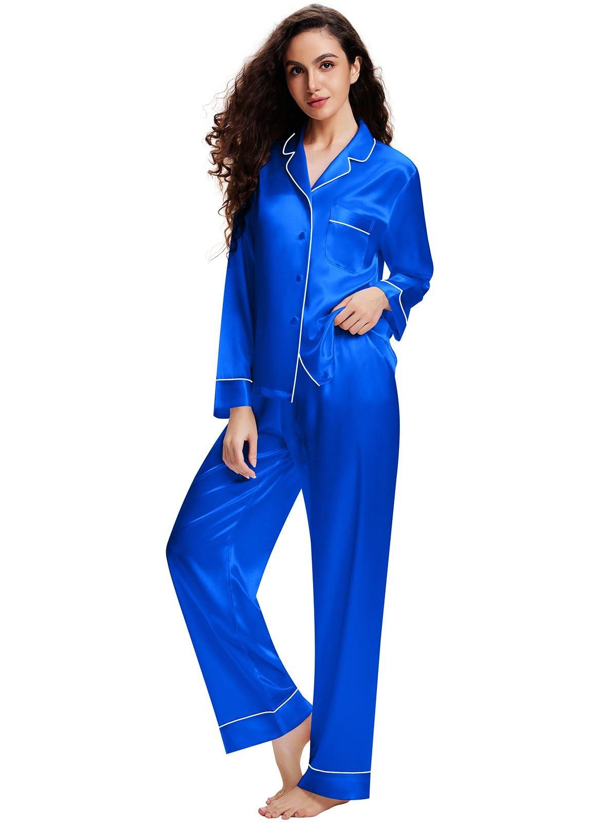 - Design: Two-Piece comfort sleepwear pajama setWomen's Long Sleeve Silk Satin Pajamas Set,Button-down,Long sleeve,one chest pocket on the top ,The Pants of the silk satin pajamas has Elastic Waist With Drawstring , Comfortable and Relaxing Fit