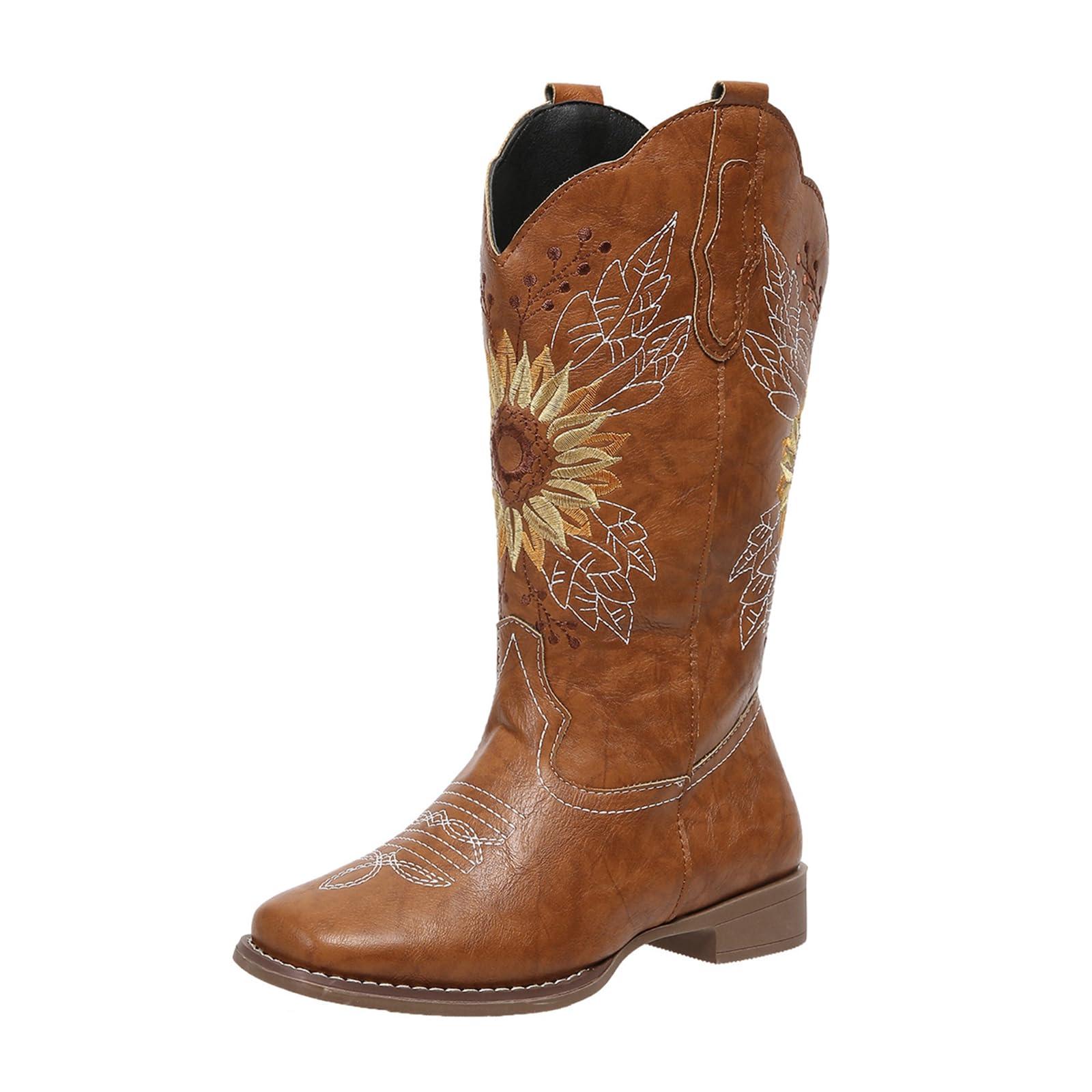 ZBYY ZBYY Womens Embroidered Sunflower Cowboy Cowgirl Boots Retro Square Toe Western Boots Chunky Heels Mid Calf Boots